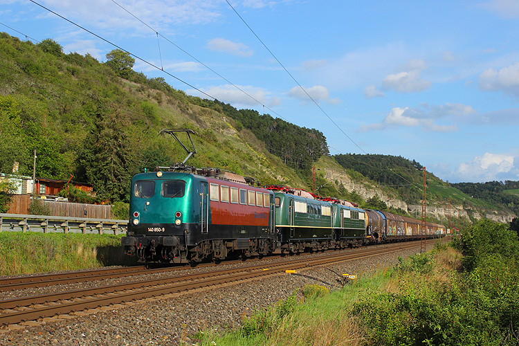 Auch das Press-Doppel 140 037+047 war mit einem Kesselzug in Richtung Würzburg unterwegs. |