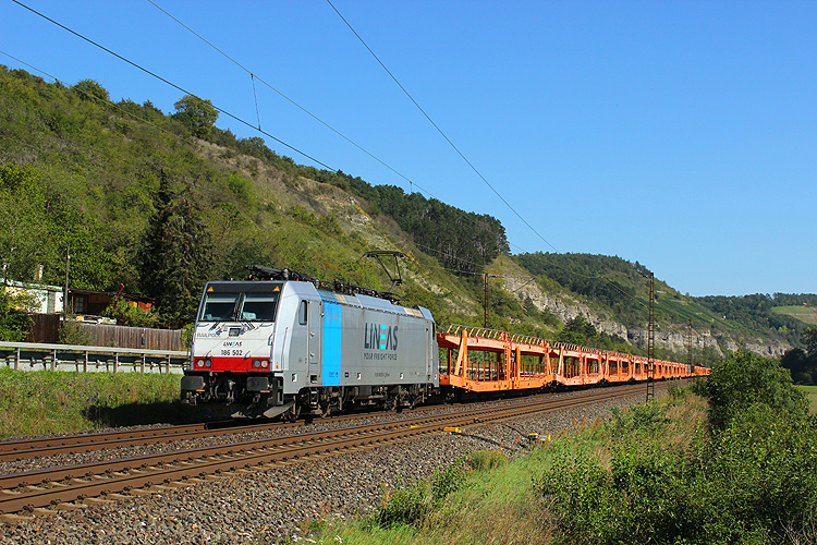 Lineas 186 502 fuhr mit einem leeren Autozug in Richtung Gemünden. |