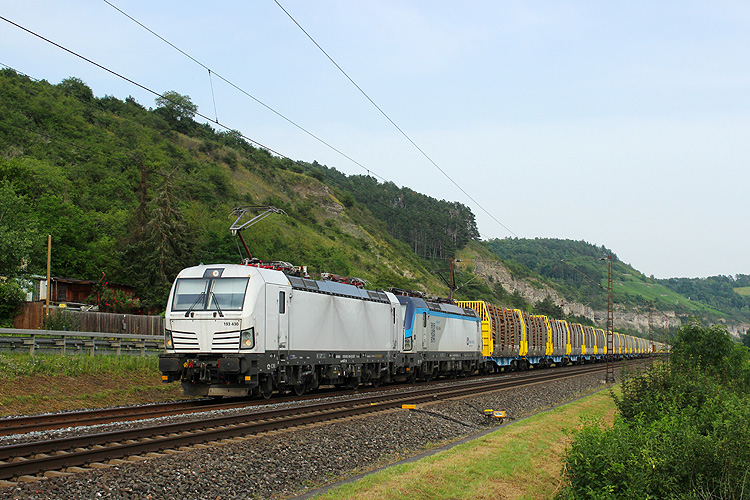 Auf der Rückfahrt wurde wieder im Maintal übernachtet. Bei 34°C und aufziehender Gewitterfront lichtete ich bei Karlstadt CD Cargo 193 430+699 mit einem nordwärts fahrenden Gigawood-Holzzug ab, 29.06.2024. |