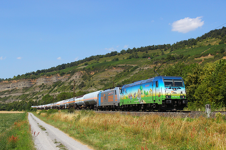 Bei Thüngersheim kam an jenem Tag HSL 185 642 mit 186 551 und Gaskesselzug in Richtung Würzburg vorbei. |