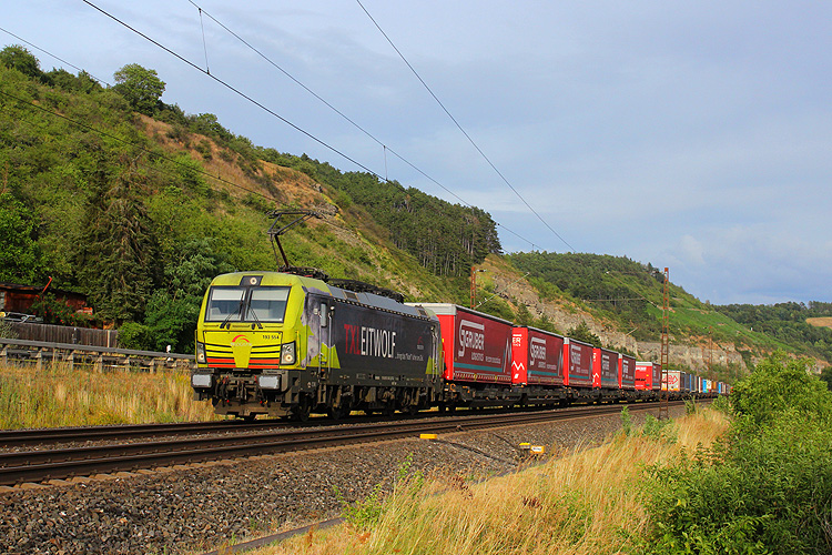 14.07.2023 bei Retzbach - TXL 193 087 mit H-Wagenzug in Richtung Würzburg. |