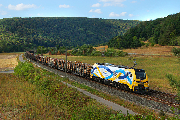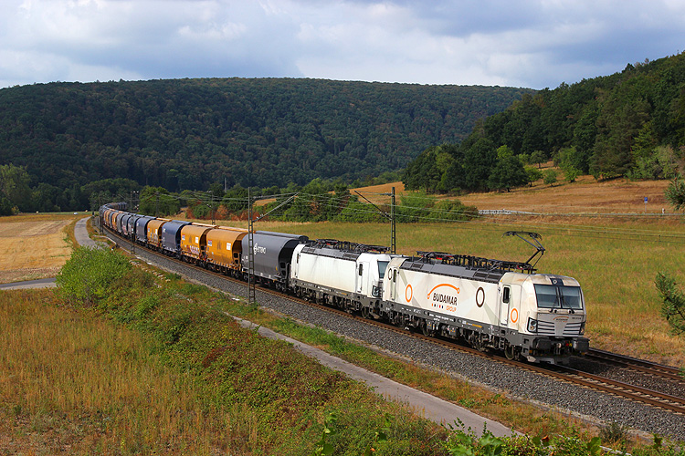 Am Montagmorgen, 29.08.2022 war bei Retzbach das Budamar-Doppel 383 219+213 mit Getreidezug nach Rheine die erste Überraschung. |