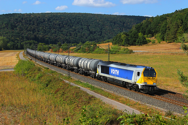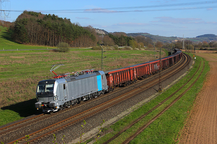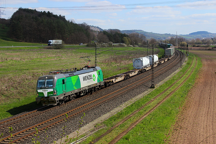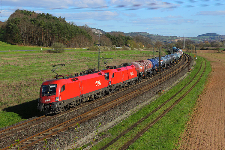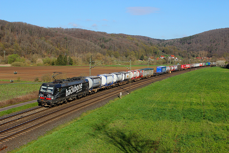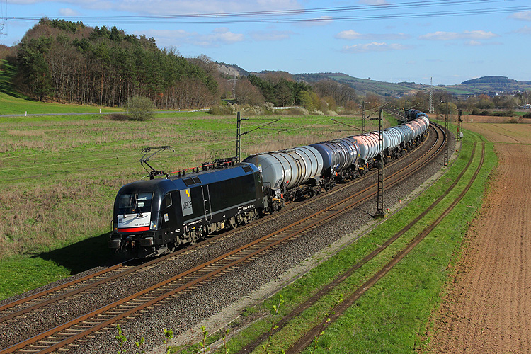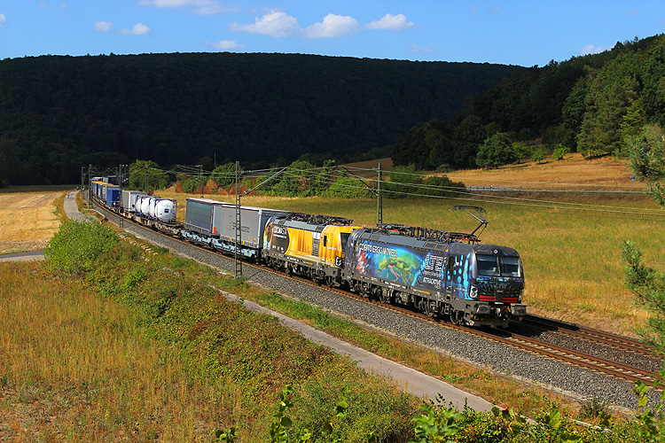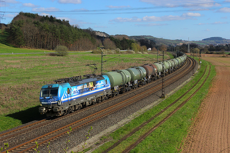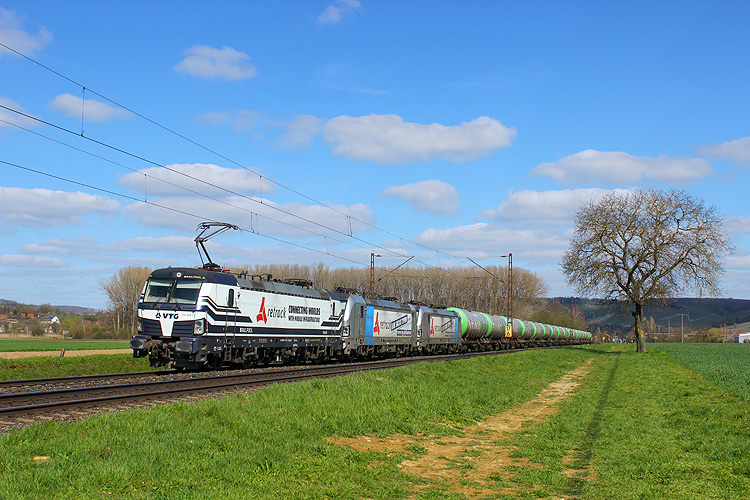 VTG 193 828 fuhr mit 193 992+993 und einem Kesselzug in Richtung Würzburg. |
