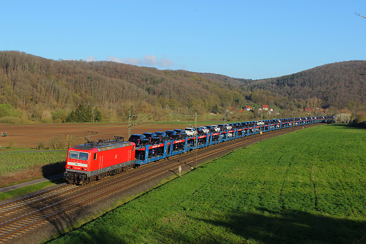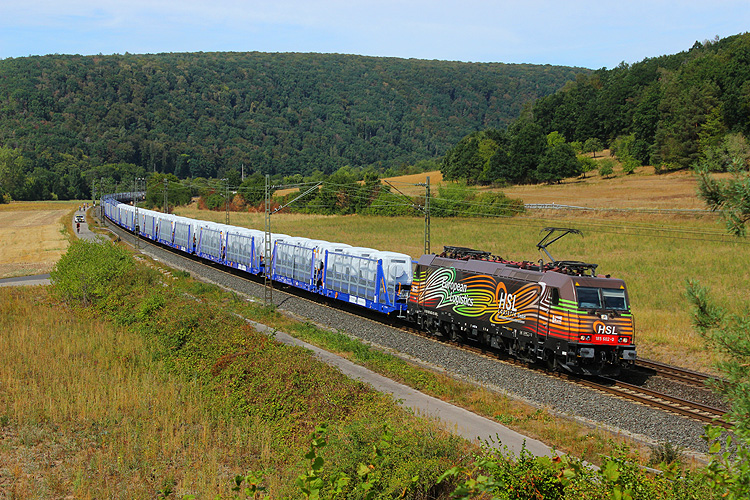 Frachtbahn 193 230 hatte einen leeren Autozug am Haken. |