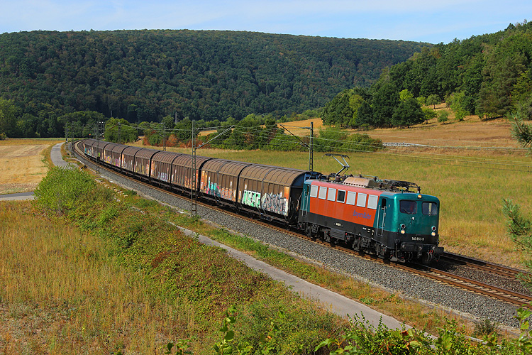 IGE 182 505 hatte ihr grünes Flixtrain-Kleid abgelegt und fuhr wieder in schwarz mit einem Kesselzug in Richtung Gemünden. |