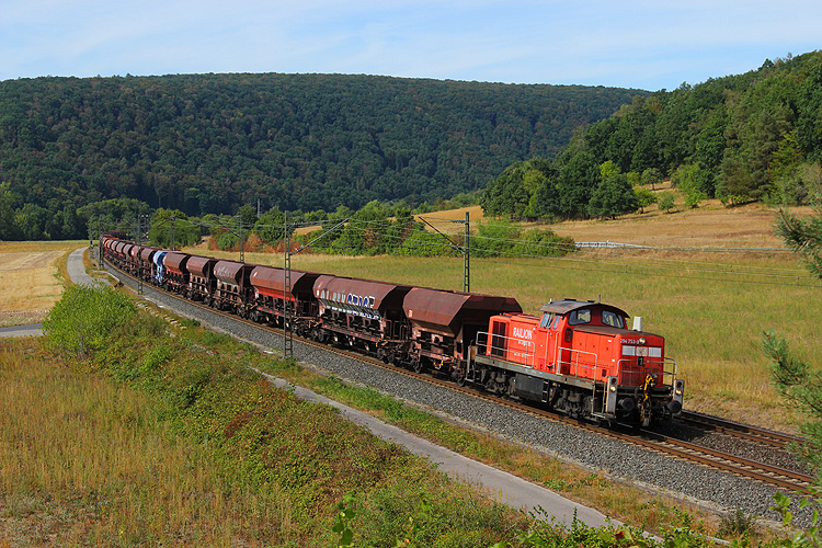 294 753 hatte in Gemünden leere Schotterwagen eingesammelt und fuhr damit in Richtung Würzburg. |