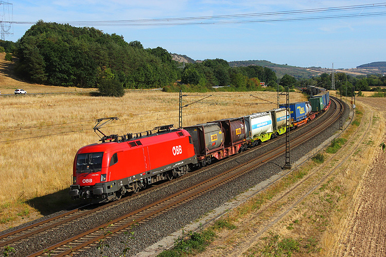 Gegen Mittag wieder der übliche Stellungswechsel nach Harrbach. Der Wenzel-KLV DGS 41950 Kalsdorf - Neuss wird nun mit eigenen Loks bespannt, 1193 900 war am Zug. |