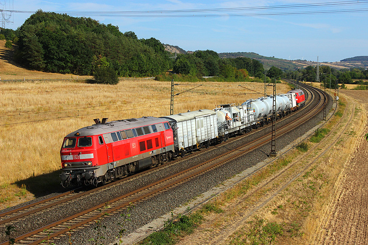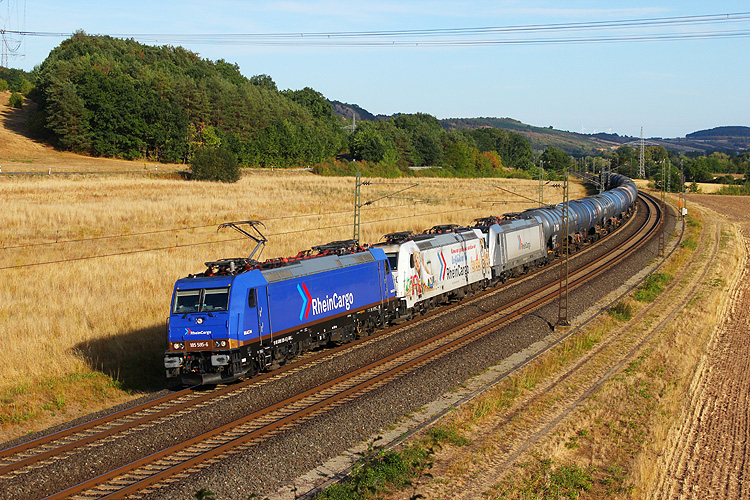 RHC 185 595 fuhr mit 185 349 + 187 075 und einem Kesselzug in Richtung Gemünden. |