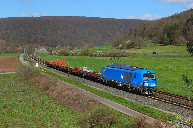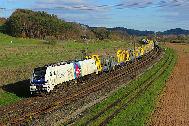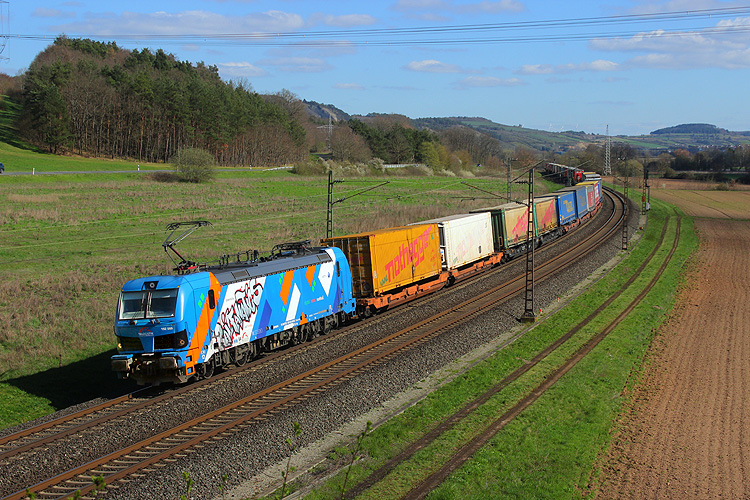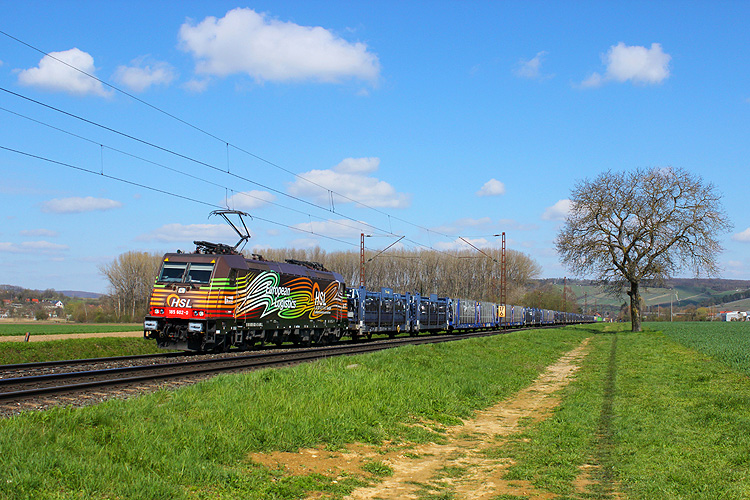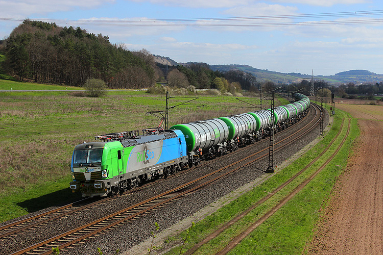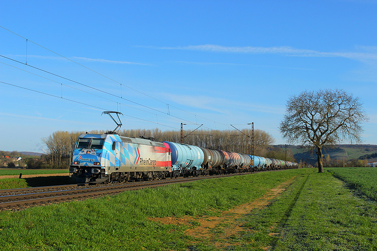 Am nächsten Morgen 04.04.2023 ging es zunächst zum Nußbaum bei Retzbach. RHC 185 350 war mit einem Kesselzug in Richtung Würzburg unterwegs. |