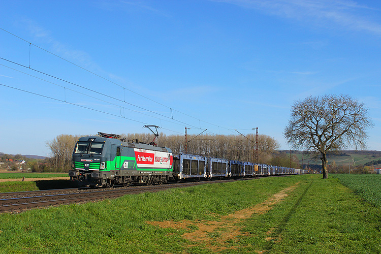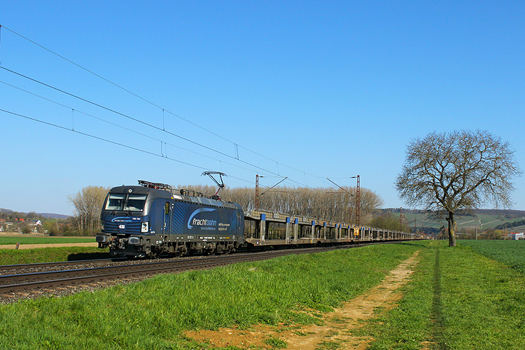 Auch am 05.04.2023 startete ich wieder in Retzbach. Frachtbahn 193 764 fuhr mit einem leeren BLG-Zug in Richtung Würzburg. |
