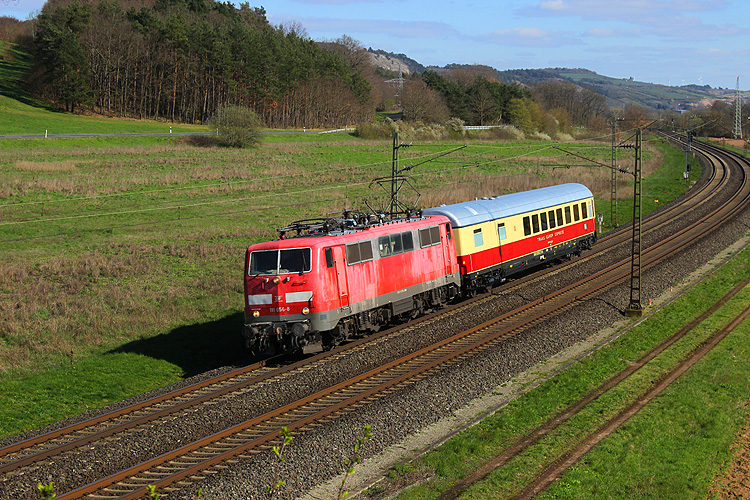 GfE 111 056 fuhr mit einem Rheingold-Wagen in Richtung Gemünden. |