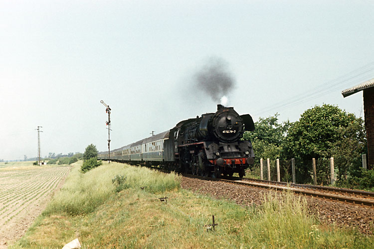 Durchfahrt frei für 41 1079 mit dem D 447 nach Leipzig an der westlichen Einfahrt von Wegenstedt, 05.06.1982. |