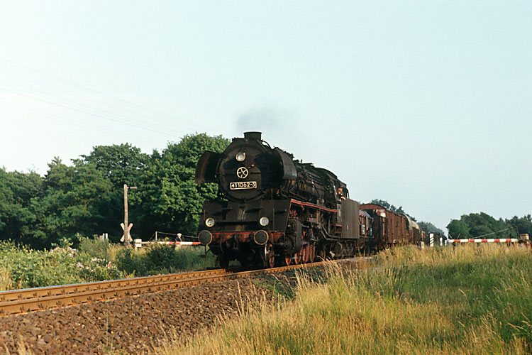 41 1062 Bw Oebisfelde mit dem Dg 53798 Magdeburg - Oebisfelde - Salzwedel am Schrankenposten Böddensell, 02.07.1982. |