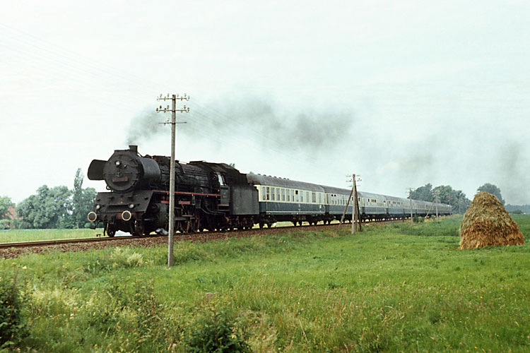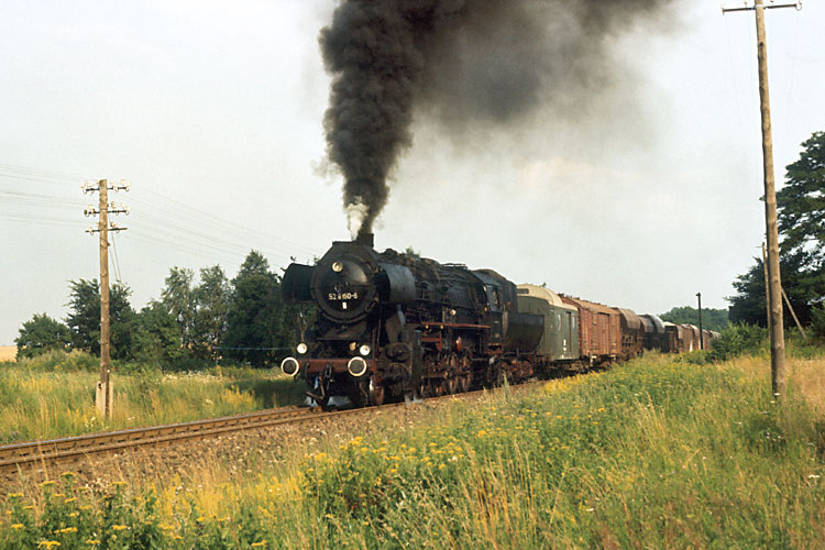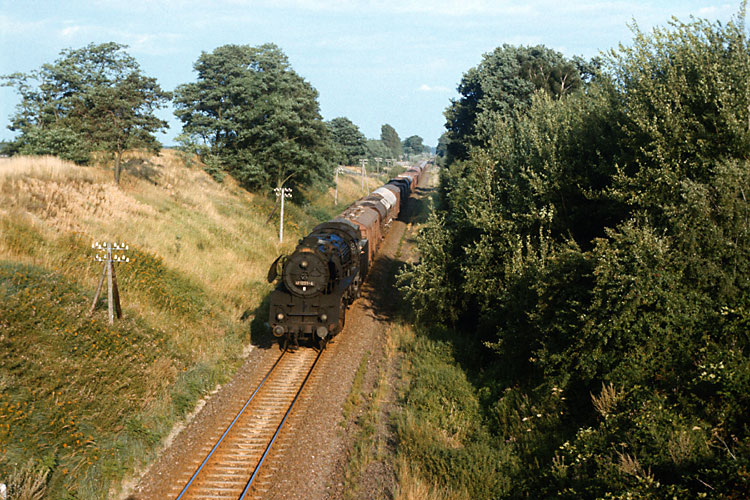 Zwischen Haldensleben und Bülstringen ist 52 8150 Bw Haldensleben mit dem Dg 53722 nach Oebisfelde unterwegs, 31.07.1984. |