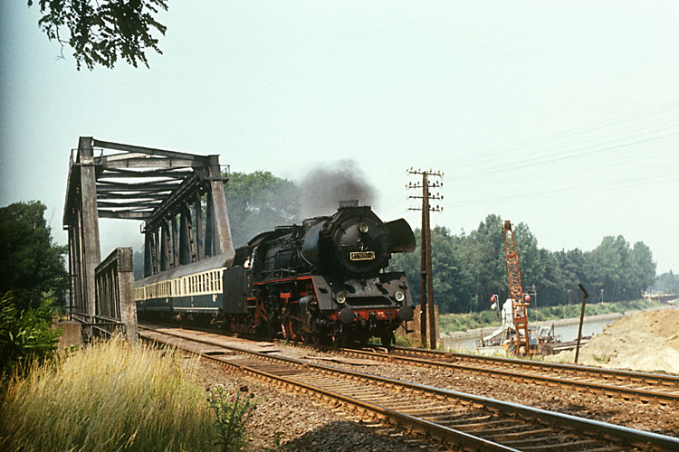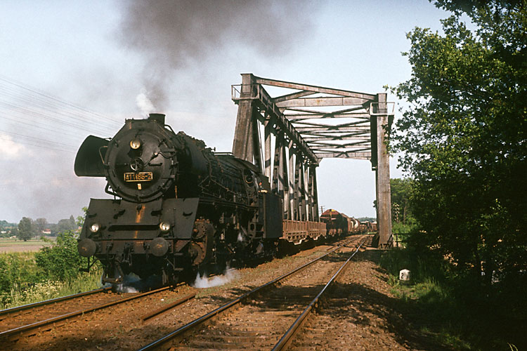 Wieder 41 1185 bei der Überquerung der Mittellandkanalbrücke bei Haldensleben, diesmal in Gegenrichtung mit dem Dg 53722 Haldensleben - Oebisfelde, 02.06.1983. Ab Sommerfahrplan 1983 gab es für die Oebisfelder 41 auf dieser Strecke nur noch Güterzüge zu fahren, statt acht waren nun nur noch drei Loks im täglichen Einsatz. |