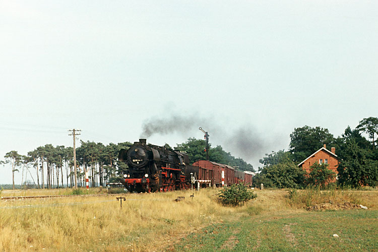 Der Kreuzungsbahnhof Bülstringen wird vom Dg 53722 - bespannt mit 52 8144 - durchfahren, 14.08.1984. |