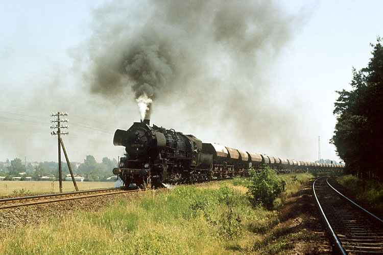 Die Haldenslebener 52 8173 schleppt den 1600 t schweren Schotterzug Gag 56704 die Steigung hinter Haldensleben zur Kanalüberquerung hoch, 08.07.1984. |