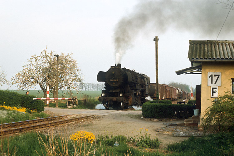 52 8136 Bw Haldensleben passiert mit dem Dg 53724 nach Oebisfelde den Schrankenposten 17 bei Bülstringen, 13.05.1985. |
