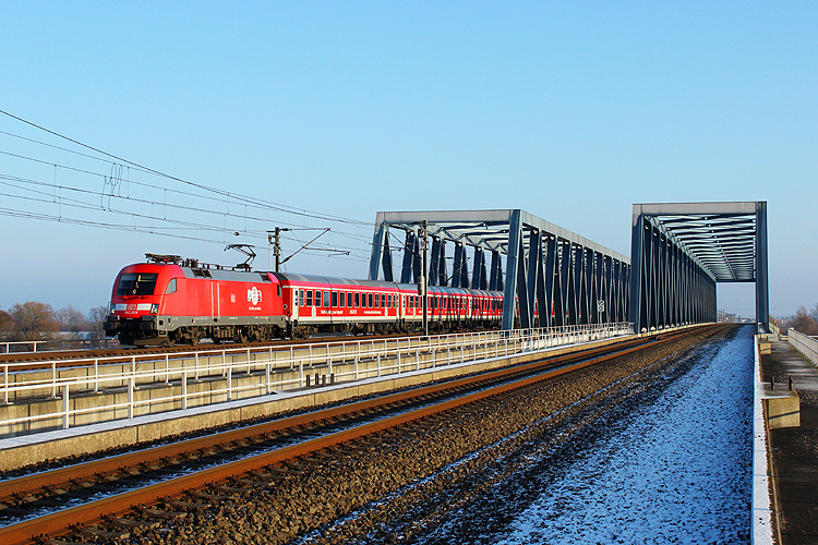 Bei Hämerten überquert hier 182 009 mit dem IRE 18098 von Berlin nach Hamburg die Elbe, 28.12.2014. Die im Zuge des Schnellbahnbaues Mitte der neunziger Jahre errichteten neuen Brücken wurden auf die Pfeiler der Vorgänger aufgesetzt. So sind die Pfeiler der Brücke der Schnellfahrstrecke fast 150 Jahre alt, nur die Strompfeiler wurden erneuert. Die Brücke der Stammbahn (rechts) ist für das zweite Gleis vorbereitet, dieses wurde beim Umbau der Strecke noch kurzfristig eingespart. |