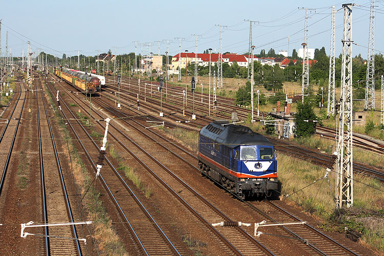 Der Verkehrsknoten Stendal hat den letzten noch betriebenen Güterbahnhof der Altmark. Die meisten Güterzüge nutzen ihn freilich nur, um sich überholen zu lassen oder wie hier, zum Kopfmachen. Die Raildox-Ludmilla 232 103 ist mit einem Holzzug aus der Lüneburger Heide in Stendal angekommen und wechselt nun an das andere Zugende, um diesen zum Zielbahnhof Niedergörne weiterzubefördern, 04.06.2011. |