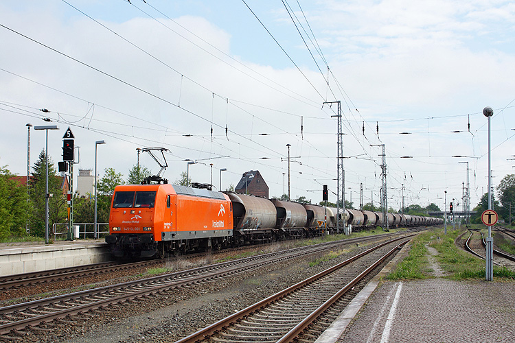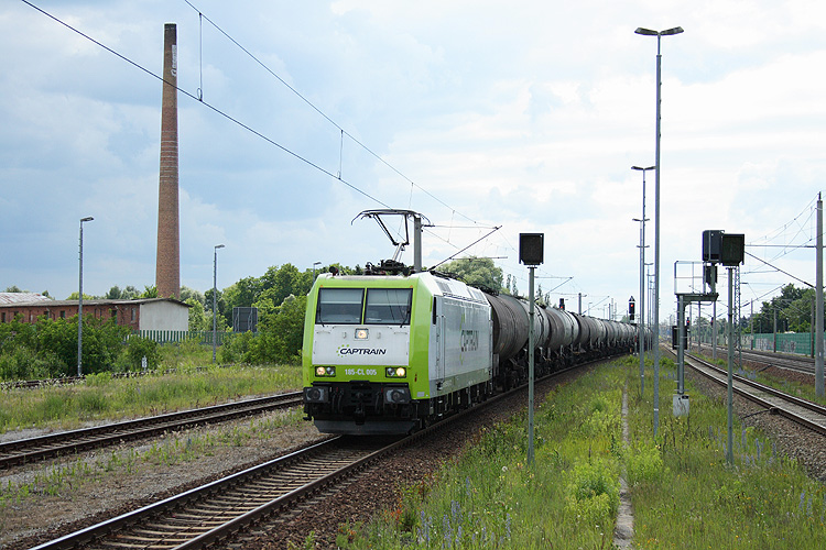 Captrain's 185-CL 005 ist mit einem Kesselzug aus Richtung Stendal bis Rathenow vorangekommen, 23.06.2012. Der Zug wechselt von der Schnellfahrstrecke auf das Stammbahngleis, das ab hier in Richtung Berlin mit Fahrleitung überspannt ist, weil ein ICE vorbeigelassen werden muß. |