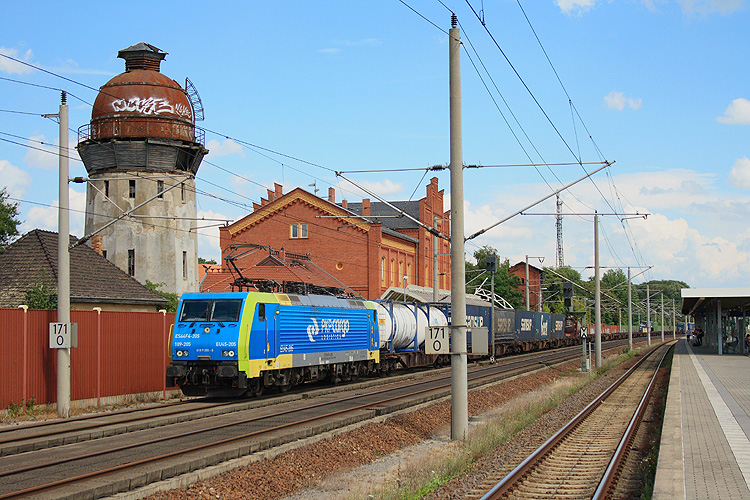 Diese sehr markante Fotostelle lockte mich an meiner Hausstrecke entlang bis ins brandenburgische. EU45-205 der PKP-Cargo durchfährt mit einem Containerzug von Poznan nach Rotterdam den Bahnhof Rathenow, 04.08.2012. |