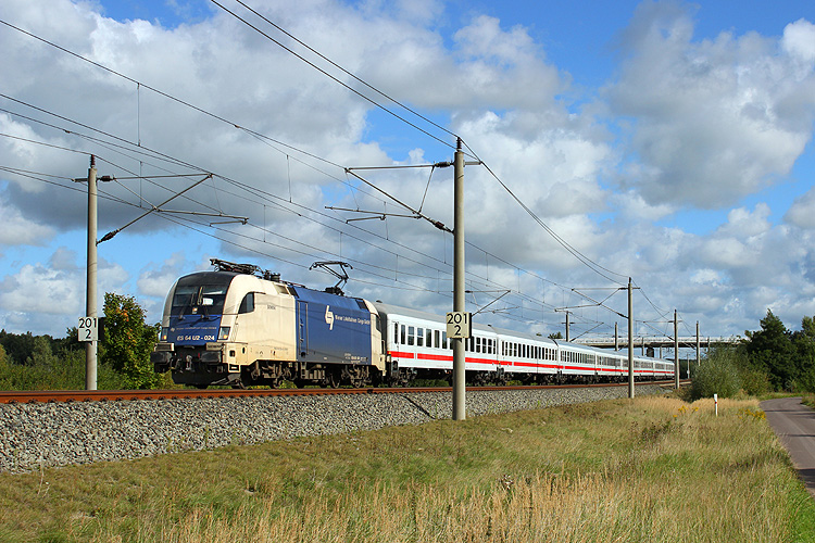 400 Meter weiter in Richtung Westen ist die von DB-Fernverkehr angemietete 182 524 der WLC nahe dem Stendaler Ortsteil Charlottenhof mit dem IC 1991 Berlin - Frankfurt/Main ebenfalls auf der Umfahrung Stendal's unterwegs, 27.09.2015. |