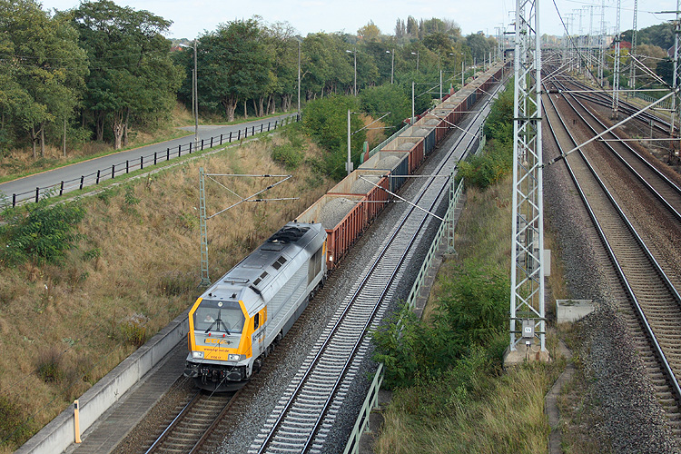 V 500.17 der SGL ist mit ihrem Kieszug hingegen auf gegenüberliegenden Seite auf dem Reisezuggleis in Richtung Oebisfelde unterwegs, 13.10.2012. Der Zug kam aus Richtung Magdeburg nach Stendal und brauchte deshalb nicht durch den Güterbahnhof fahren. Bei den Umleiteraktionen ist die Führung der Umleiter-Güterzüge von Oebisfelde über Stendal in Richtung Magdeburg gängige Praxis, nur wenige Umleiter dürfen den direkten Weg über Rathenow nehmen. |