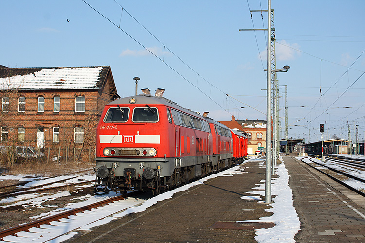 Am westlichen Außenbahnsteig, wo einst die Personenzüge nach Oebisfelde fuhren, steht heute der Stendaler Hilfszug abgestellt. Dieser kommt natürlich nur selten zum Einsatz. Am 15.03.2013 war auf der Schnellfahrstrecke nahe Miesterhorst ein ICE mit Schäden an einem Drehgestell liegengeblieben. Die Abschlepploks aus Berlin-Grunewald 218 833 + 832 mußten deshalb den Hilfzugwagen mit zum Einsatzort nehmen, um mit dem in diesem vorhandenen Gerät das defekte Drehgestell aufbocken zu können. |