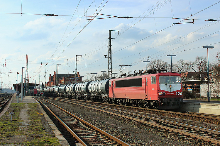 Mit einem Kesselzug in Richtung Berlin legt 155 078 der LEG einen Überholhalt im Gleis 1 ein, 27.02.2016. |