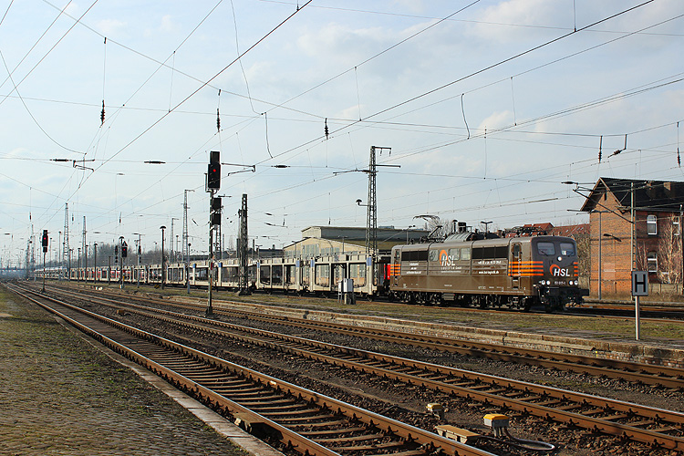 Mit einem Autologistikzug der BLG aus Hamburg kommend durchfährt die HSL 151 017 den Stendaler Personenbahnhof in Richtung Berlin, 27.02.2016. |