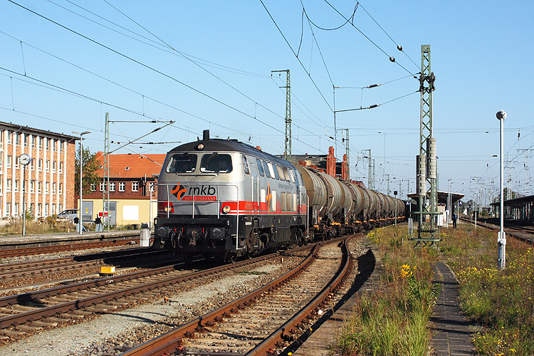 Mit einem Kesselzug aus Stendell kommend durchfährt V6 der MKB den Stendaler Bahnhof in Richtung Oebisfelde, 03.10.2013. |