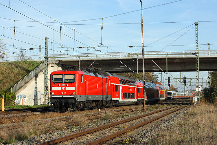 Während der monatelangen Sperrung der Strecke Richtung Berlin nach dem Jahrhunderthochwasser 2013 der Elbe wurden die Gleise an der östlichen Ausfahrt aus dem Bahnhof Stendal teilweise zum Abstellen in Stendal wendender Reisezüge genutzt. Hier wartet 112 170 mit ihrer Doppelstockgarnitur auf die Rückfahrt als RB 17568 nach Salzwedel. Die IC-Garnitur im Hintergrund war am Vormittag als IC 2388 aus Frankfurt (M) gekommen und wird am Nachmittag als IC 2385 nach Karlsruhe starten, 31.10.2013. |