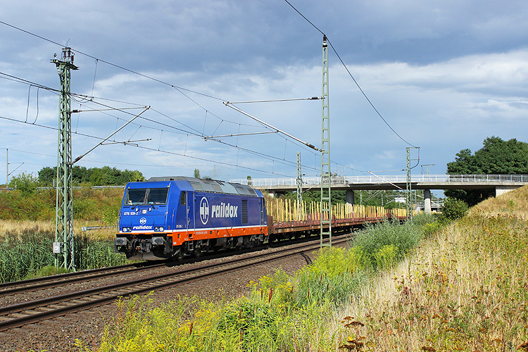 Auch Raildox 076 109 fährt mit einem leeren Holzzug in Richtung Westen, sie hatte den Zug zuvor schon von Niedergörne nach Stendal gebracht, 21.08.2016. |