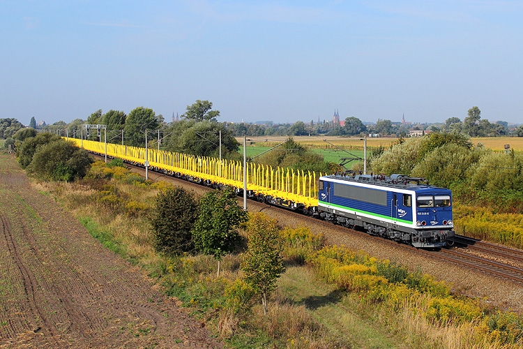 155 048 der Press hat in Borstel einen leeren Holzzug aus Niedergörne übernommen, den Bahnhof Stendal durchfahren und fährt nun auf den Stammbahngleisen bei Bindfelde in Richtung Abzweig Staffelde, wo der Zug auf die Schnellfahrstrecke einfädeln wird, 25.09.2016. |