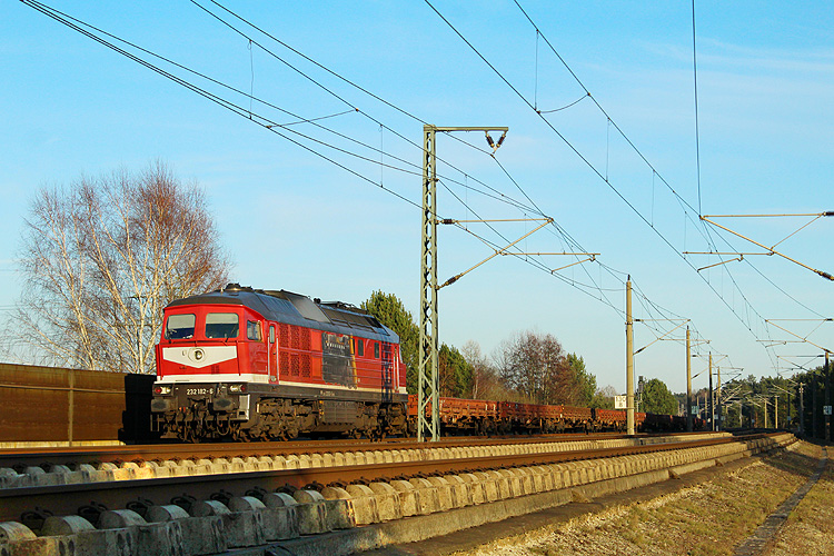 Am 07.02.2023 kam WFL 232 182 mit einem leeren Flachwagenzug in Richtung Oebisfelde gefahren. |