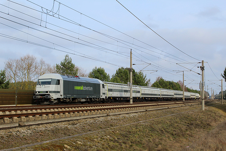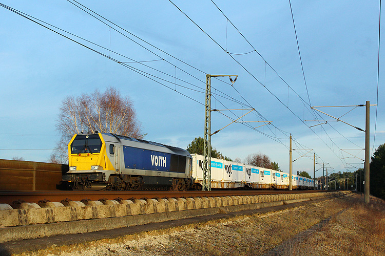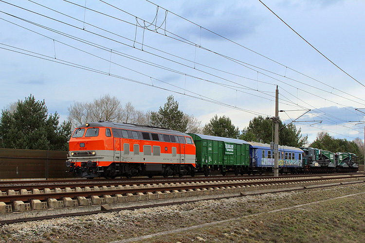 Am 07.03.2024 kam die nun für Railadventure fahrende ex WLC 1216 950 mit einer Talgo-Testfahrt westwärts fahrend durch Jävenitz. |