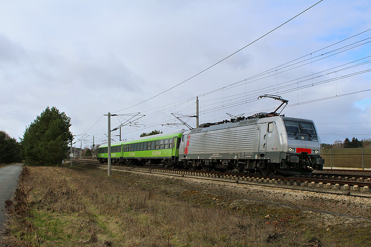 Am 05.03.2023 überführte Akiem 189 842 zwei Flixtrain-Wagen in Richtung Stendal. |