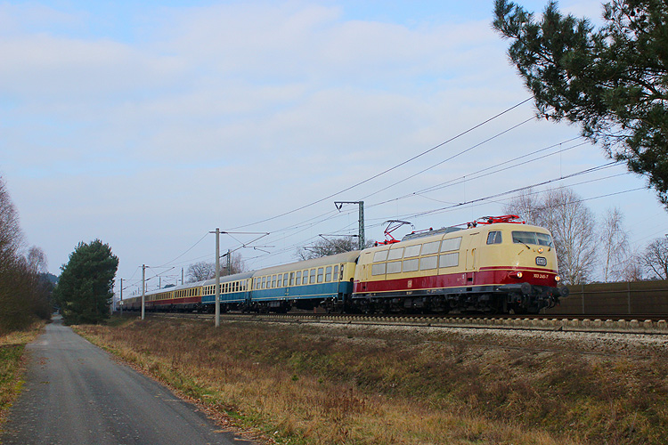 Am 09.03.2024 fuhr Museumslok 103 245 mit dem Sonderzug F 337 Bielefeld - Warnemünde durch Jävenitz. |