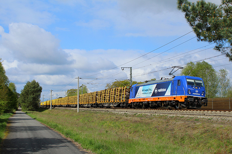 Am 20.04.2024 war Raildox 187 317 mit einem Holzzug nach Niedergörne unterwegs. |