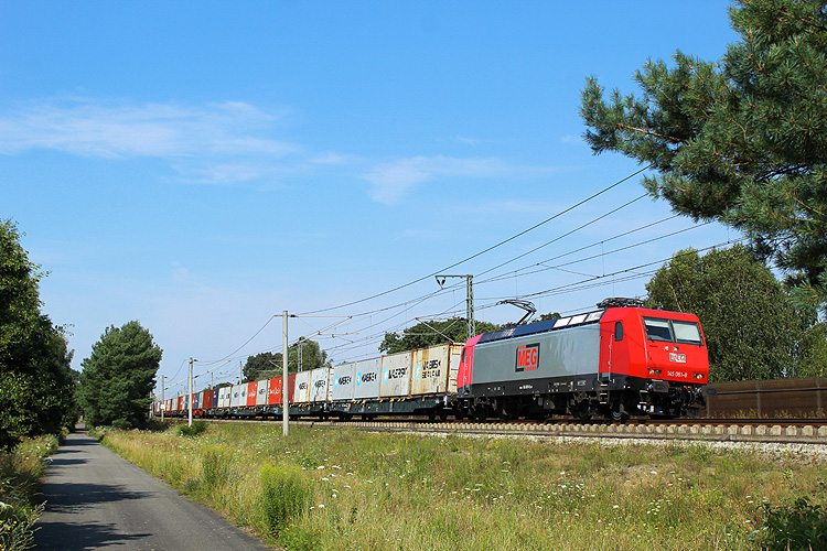 Am 21.07.2024 fuhr MEG 145 061 mit dem Containerzug Bremerhaven - Leipzig über die HGV. |