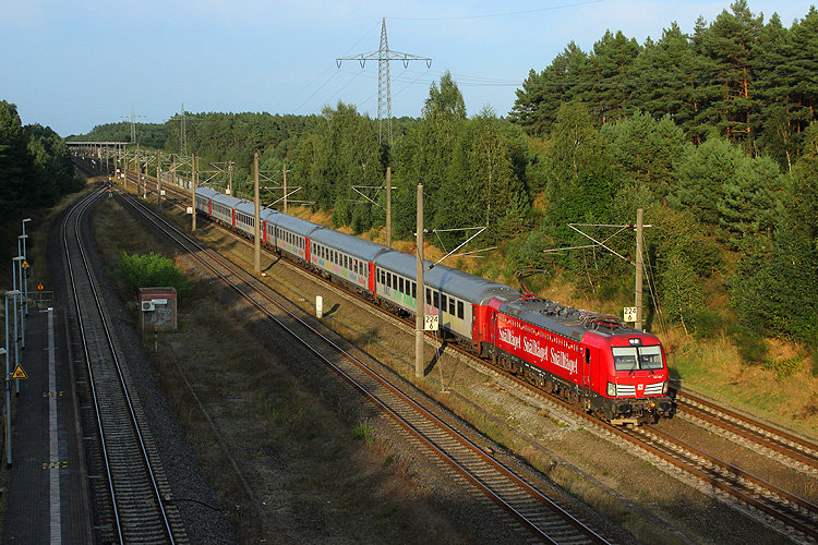 Wegen der Bauarbeiten an der Strecke Berlin - Hamburg wurde auch der Snälltoget D 306 Dresden - Stockholm über meine Hausstrecke umgeleitet, am 01.09.2024 gezogen von 193 965 und aufgenommen bei Uchtspringe. |