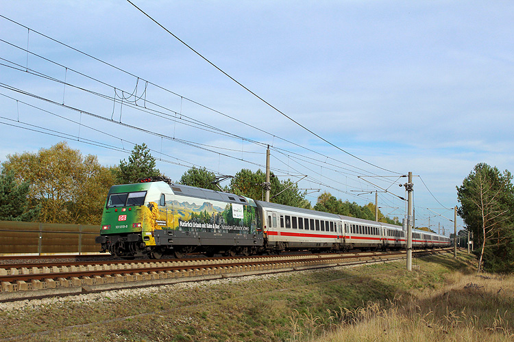 Am 17.10.2024 hing die "Fahrtziel Natur" 101 019 vor dem wegen Bauarbeiten verkehrenden Ersatzzug IC 2562 Berlin - Hannover. |