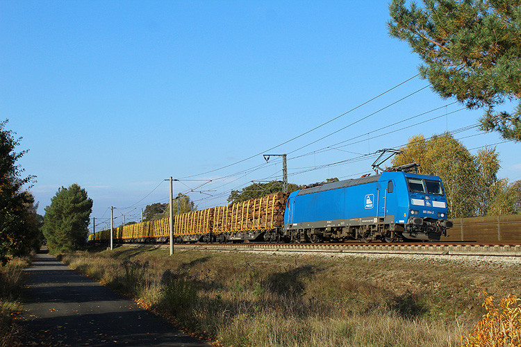 Am 19.10.2024 brachte Press 185 064 einen Holzzug für Niedergörne nach Borstel. |
