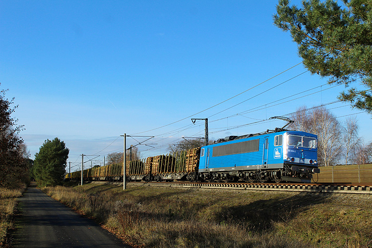 Am 23.11.2024 war Press 155 059 mit einem Holzzug für Niedergörne nach Borstel unterwegs. |
