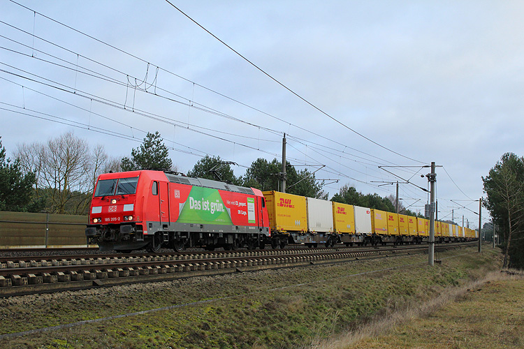 Am 15.12.2024 fuhr der DHL-Zug Berlin - Bönen über die HGV, bespannt mit 185 205 "das ist grün". |