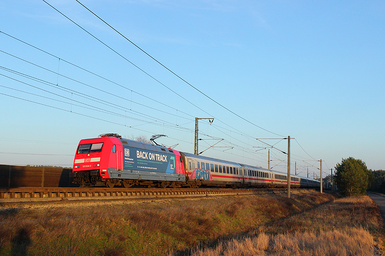 Am 17.01.2020 bekam ich die frisch beklebte Werbelok 101 068 "Back on Track" mit dem IC 142 Berlin - Amsterdam vor die Linse. |