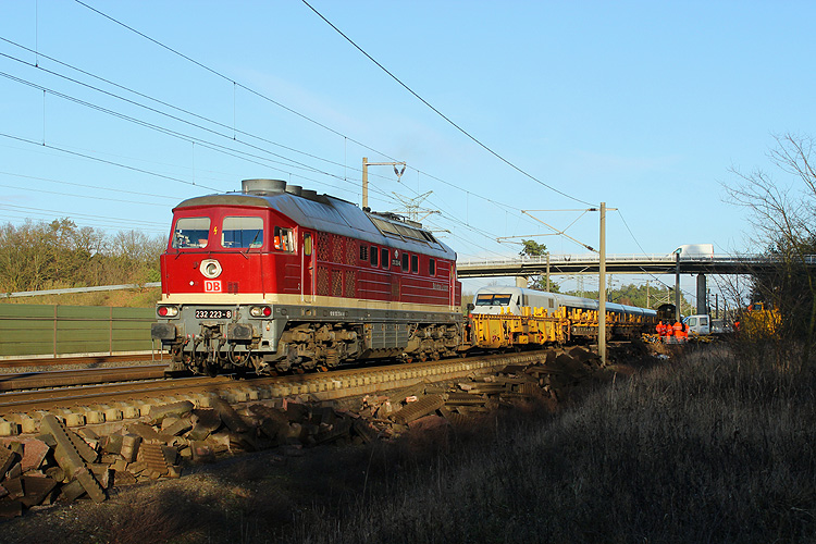 Anfang Februar wurden die Schienen der Süd-Gleises der HGV zwischen Uchtspringe und Gardelegen erneuert. Außerdem wurden die maroden Schalldämpf-Steine entfernt. Für die Baustellen-Logistik war Bahnbau 232 223 zuständig, 04.02.2020. |