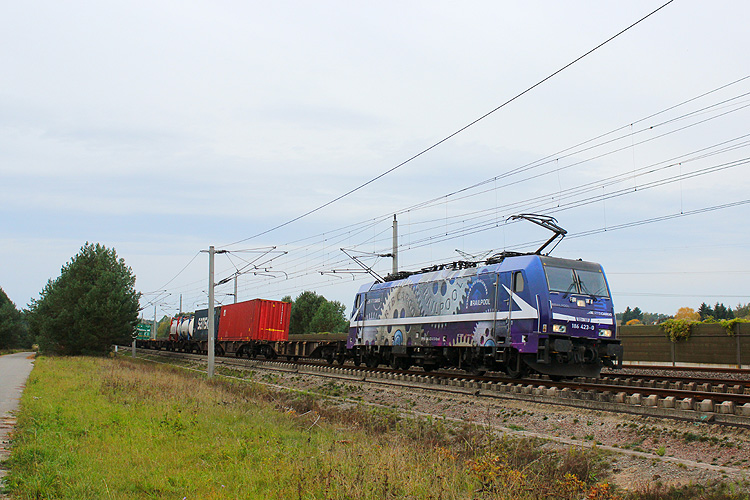 Am 20.10.2020 kam RTB 186 423 "Clockwork" mit dem Containerzug DGS 52451 Rheinhausen - Frankfurt/Oder über die HGV. |