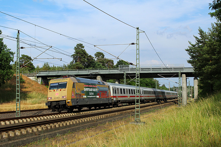 Am 19.06.2023 hing die "Dampfbahn-Route Sachsen" 101 088 am Zusatzzug IC 2536 Stendal - Hannover, der während der Bauarbeiten bei Rathenow wegen der über Magdeburg umgeleiteten IC und ICE verkehrte. |